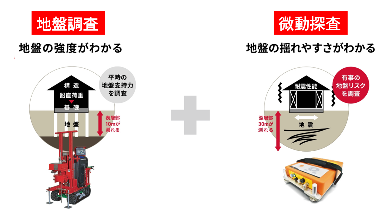 2つ目は地盤の柔らかさを調べる「微動探査」です。ハザードマップよりも細かいレベルで地震発生時の揺れやすさを調べることができます。前章でご覧いただいた羊かんとプリンの比較動画を思い出してください。もしプリンのように揺れやすい地盤であれば地震発生時に受けるダメージが大きくなり、耐震性を高めた家でも倒壊してしまう可能性があります。地盤の状態をピンポイントで把握し、それに応じた耐震設計を行うことが重要です。ただし微動探査は必須の調査ではないので、建築予定地が決まった段階で「微動探査を行いたい」と住宅会社さんに相談しましょう。